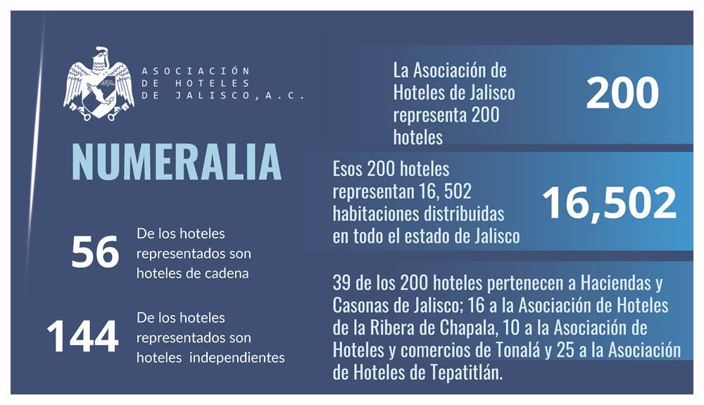 La Asociación de Hoteles de Jalisco A.C. ofrece a sus agremiados representación de los intereses comunes, vinculación y sinergia para identificar oportunidades de negocios, información para la toma de decisiones y estrategias para el desarrollo de capacidades y mejorar la competitividad.